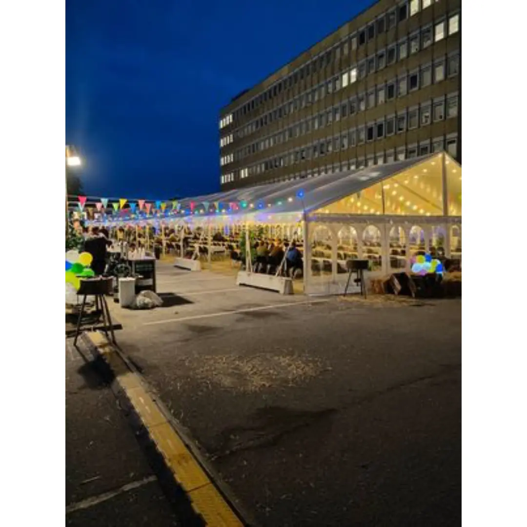 Lyskæder er teltenes klassiker af en grund. De giver en jævn, varm glød og tegner rummet smukt. Vælg gerne 2200 til 2700 kelvin for middag og mingling, mens 3000 kelvin kan bruges i bar og serviceområder for lidt friskhed. Festoon-lyskæder med klare pærer giver retning og format, mens fairy lights fungerer som en fin stjernehimmel.
