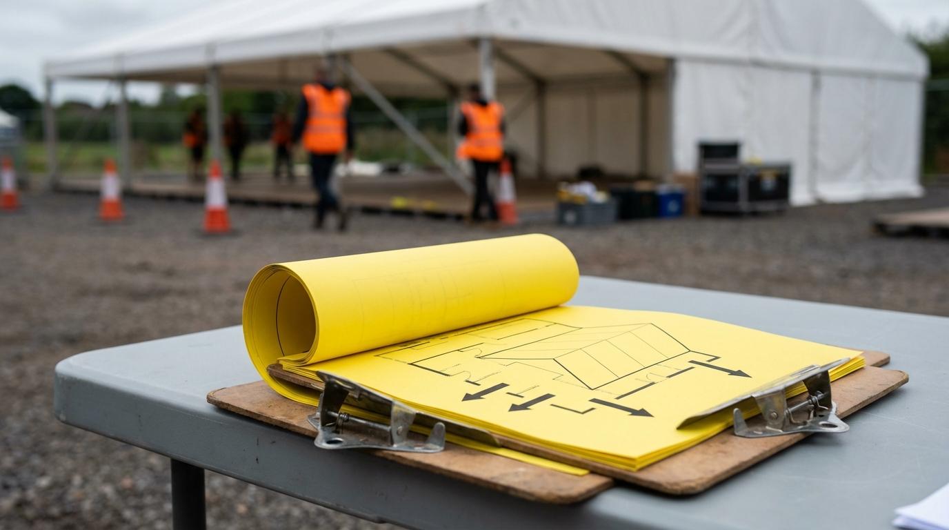 - Tegninger i målestok: teltplacering, udgange, inventar, hegn, adgangsveje